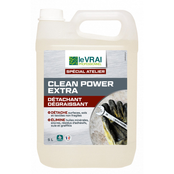 DETACHANT & DEGRAISSANT ULTRA-PUISSANT Recommandé pour les environnements industriels, le Clean Power Extra détache tous types de surfaces, sols et textiles non fragiles. Il élimine efficacement les taches tenaces : huiles minérales, encres, résines, résidus de colle d’adhésifs, etc. Avantages produit ▪ Efficacité professionnelle puissante ▪ Double action détachante et dégraissante ▪ Efficace sur de nombreux matériaux Mode d’emploi Pulvériser à 10-15 cm de la zone à détacher. Laisser agir quelques instants pour les taches les plus tenaces. Frotter et rincer avec une éponge humide. Laisser sécher. Tester la compatibilité des matériaux sur une surface peu visible avant toute première utilisatio