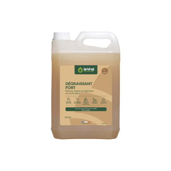 Le VRAI PROFESSIONNEL DEGRAISSANT FORT est particulièrement adapté aux secteurs alimentaires, industriels, collectifs et sportifs. Sa formule très concentrée est soluble en eau chaude ou froide et également en eau de mer. Industries, collectivités : nettoyage de tous types de surfaces, ciments, sols carrelés, peints, en résine... des ateliers, entrepôts, parties communes d'immeubles, containers, garages, stations-services, parkings... Alimentaires : dégraissage des sols, surfaces, hottes, filtres à graisse, etc. Apte au contact alimentaire après rinçage à l'eau potable (conforme à larrêté du 19/12/2013). Peintres professionnels : lessivage des murs, panneaux, etc. et préparation avant peinture. Plaisance : nettoyage de la cale au pont des bateaux professionnels ou de plaisance.